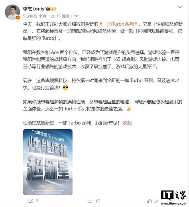 一加中国区总裁李杰在微博称,“我们相继推出了 165 超高刷、风驰游戏内核、电竞三芯等行业领先的游戏技术,收获了职业选手、游戏玩家的大量好评。现在,这些旗舰黑科技,将在第一时间来到全新的一加 Turbo 系列,普及速度之快,也是行业首次!如果你既想要超高帧的满帧性能,又想要超巨量的电池,同时还要超防水超耐用的全面体验,那么一加 Turbo 系列将是你的最佳之选。”