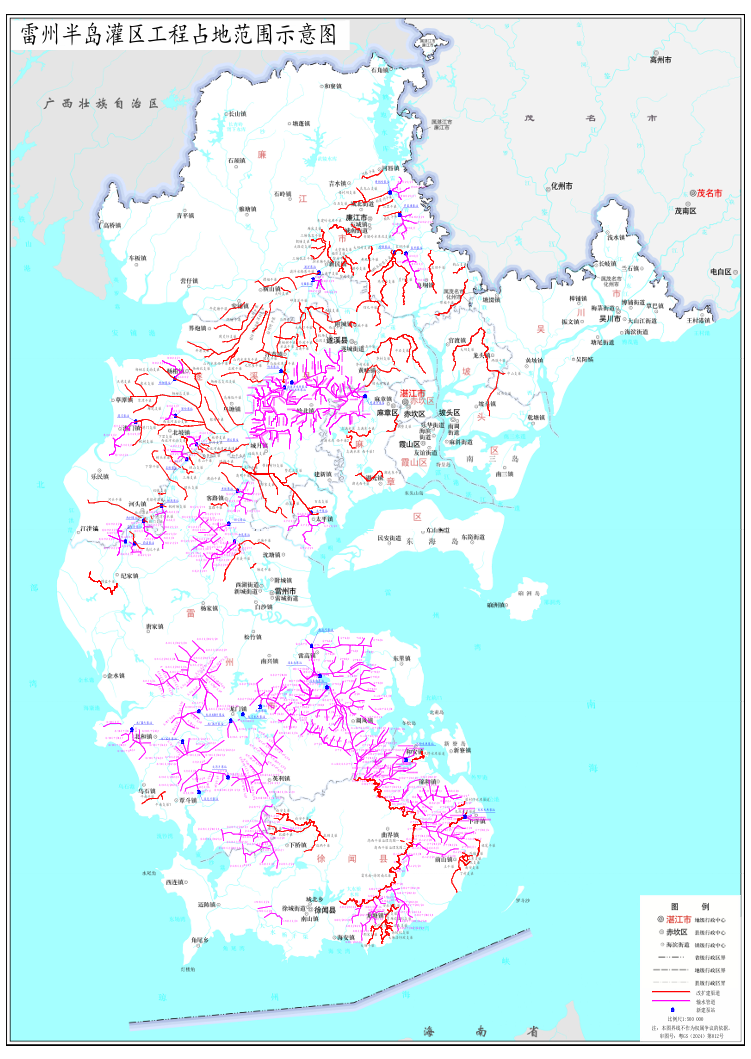 该工程建设占地范围涉及湛江市辖区的廉江市、遂溪县、吴川市、坡头区、麻章区、雷州市及徐闻县共7个县(市、区)、65个镇(街道)(新增麻章区湖光镇、坡头区坡头镇以及廉江市城北街道、城南街道、吉水镇和徐闻县海安镇、下桥镇共7个镇街)的部分村庄,包括改扩建干支渠、渠系建筑物、新建泵站及输水管线沿线检修阀井等建筑物的占地范围。